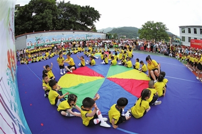 在小太阳幼儿园,幼儿园与凤山街道红豆社区一起慰问留守儿童,为他们送去学习用品、羽毛球拍、经典书籍,鼓励他们从小树立志向、健康成长。(代君君)